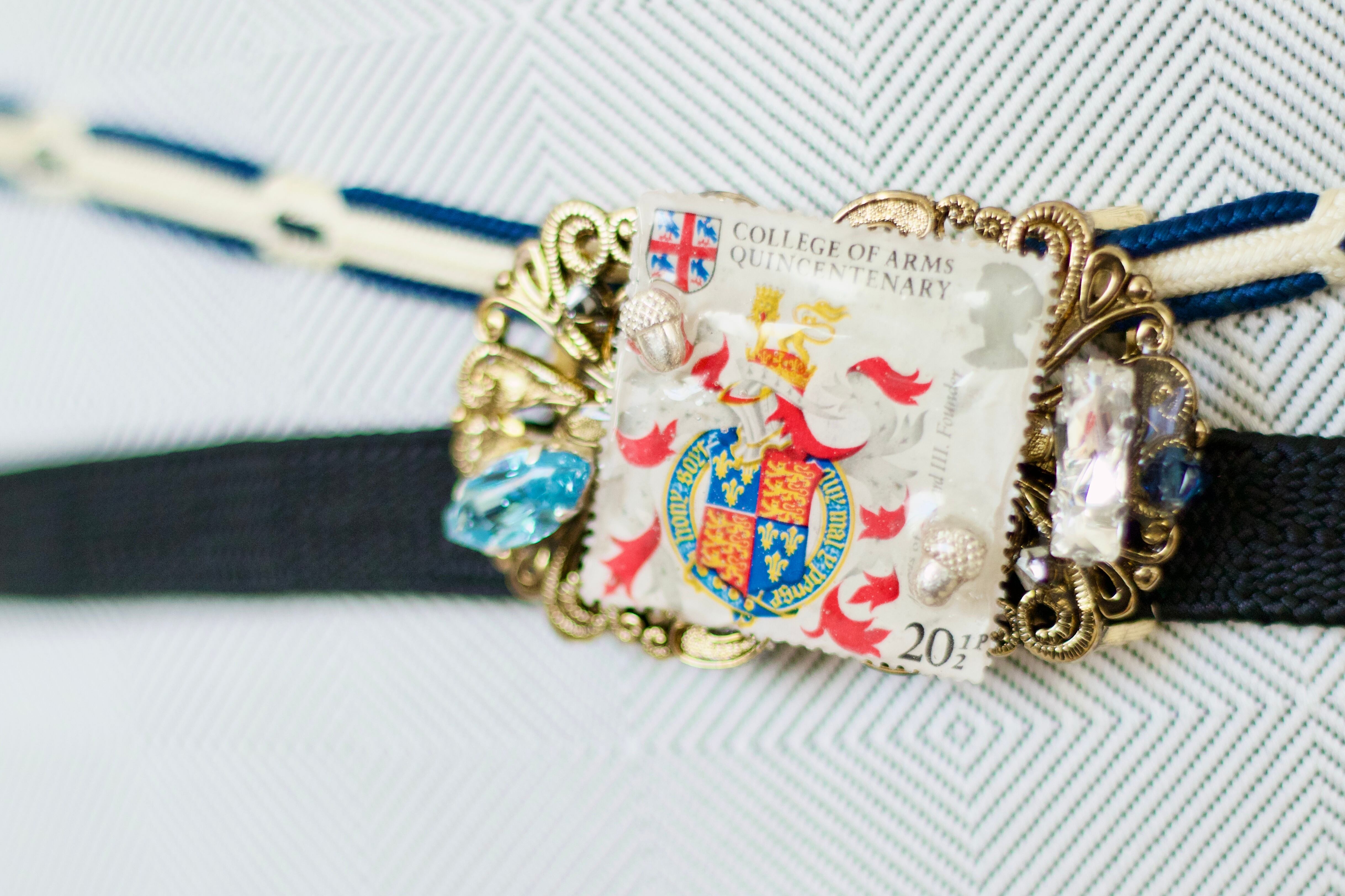 1984年製イギリス紋章デザイン古切手をプラスティック加工。 アンティークベルトの金具をベースに石と組み合わせてデザインいたしました作家作品1点もの。
